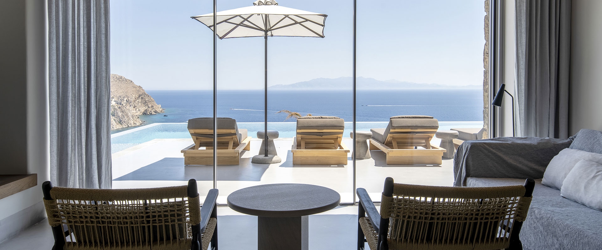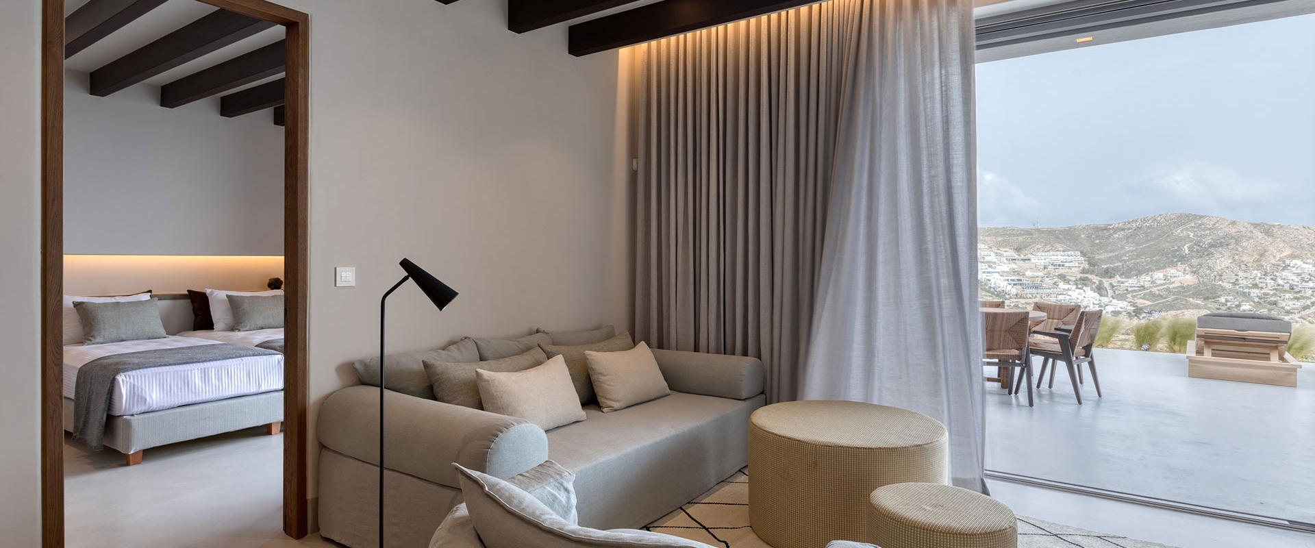 - Twin/Double bedroom with a queen-sized bed, en-suite bathroom (shower), Smart TV, A/C and direct access to the outdoor area with panoramic sea view