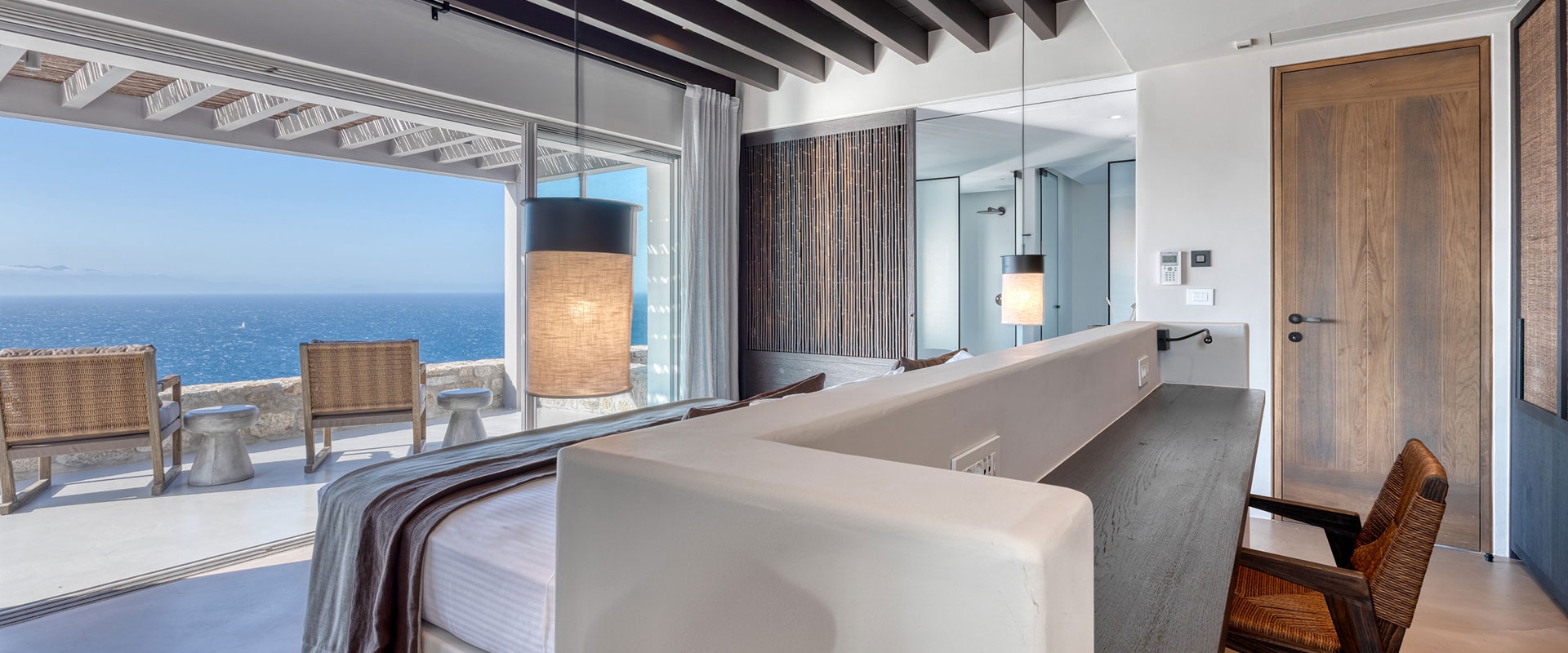 - Double bedroom with a queen-sized bed, en-suite bathroom (shower), Smart TV, A/C direct access to a terrace and panoramic sea view